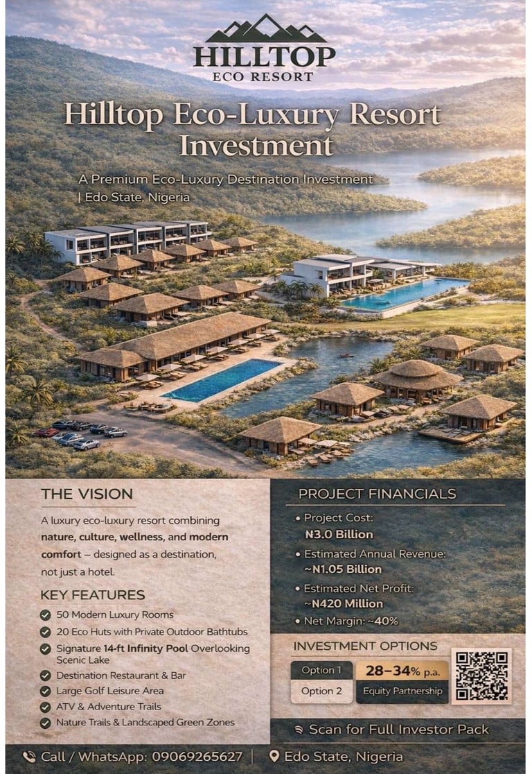 Reach out to discuss investment opportunities at Hilltop Eco Luxury Resort.